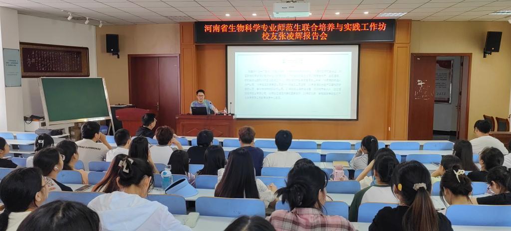 为激励生物科学专业师范生生勤学践行,让同学们深入理解未来师范生就业的内涵和成长途径,5月31日下午,应“名师引领——河南省生物科学专业师范生成长工作坊”的邀请,我院2010届优秀校友张凌辉在生物楼钟秀大讲堂举行报告会。院长饶本强、教学秘书以及学院部分师生参加了报告会。报告会由院长饶本强主持。