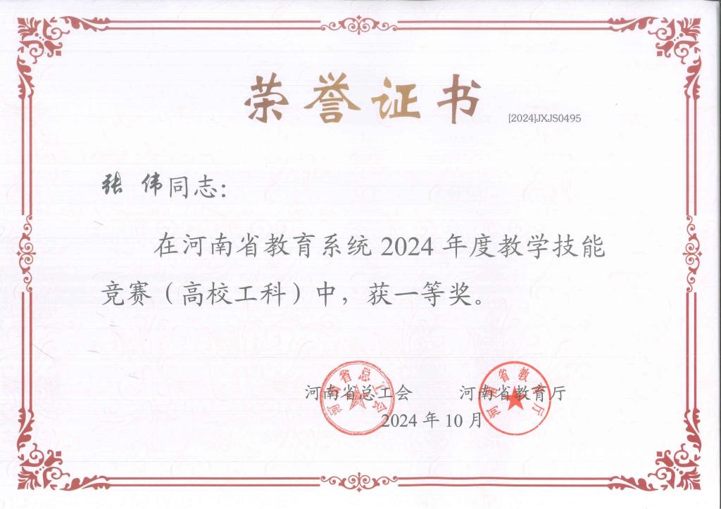 近日,河南省总工会、河南省教育厅联合发布《关于河南省教育系统2024年度教学技能竞赛获奖情况的通报》(豫工文〔2024〕89号),我院教师张伟荣获河南省教育系统2024年度教学技能竞赛(高校工科)一等奖。