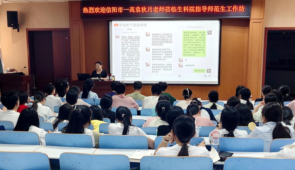 6月10日,信阳市第一高级中学资深班主任袁秋月教师应我院河南省生物科学专业师范生联合培养与实践工作坊的邀请,在生物楼414报告厅举办了一场题为《用心育人——我的班主任成长之路与教育心得》的专题讲座。工作坊教师赵昕梅、教学秘书靳建锋及百余名师范生参加了本次讲座。讲座由副院长彭波主持。