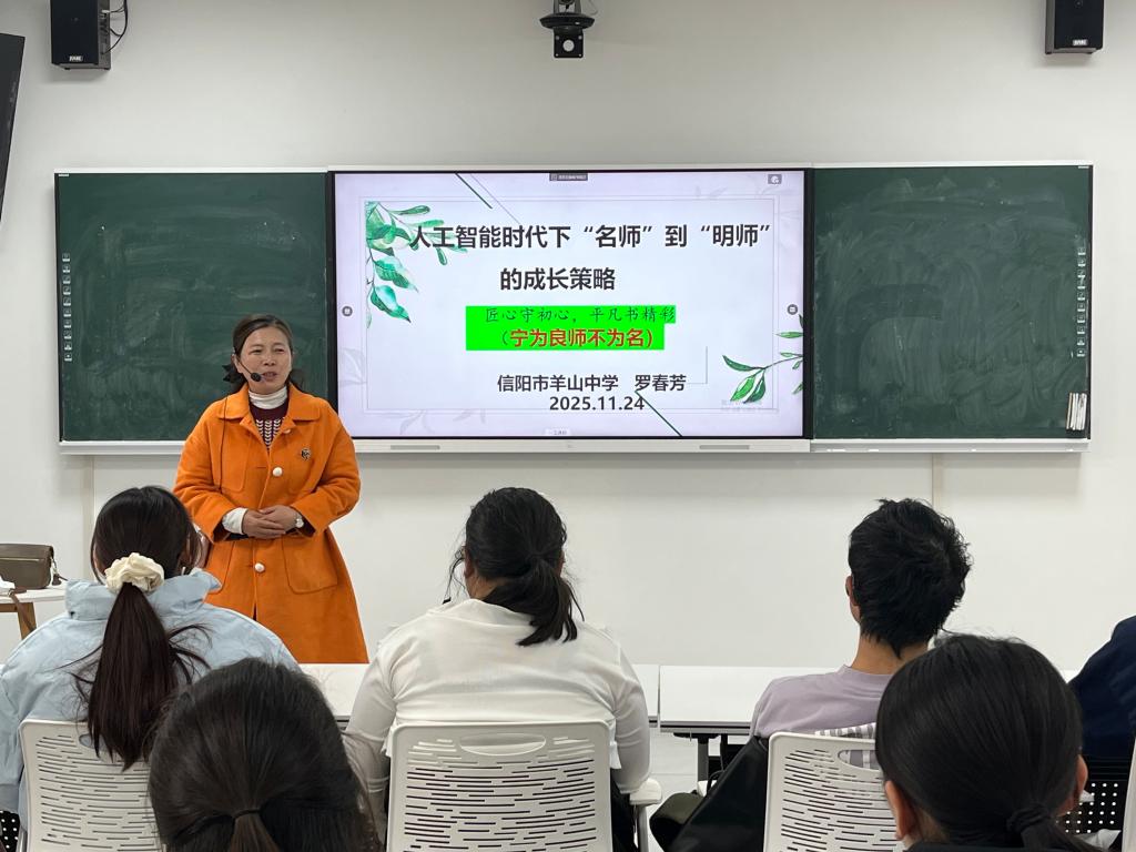 荆胜利副院长主持开场。信阳市羊山中学高级教师、中原名师罗春芳作题为《智能时代下“名师”到“明师”成长策略》的专题报告。她结合教学实践,指出生物教育在智能时代的发展趋势,强调师范生既要扎实专业基础,也要善用虚拟仿真、项目式学习等数字化手段提升教学效果。她勉励学生:“‘明师’应明晰育人初心,既要传授知识,更要培养学生的科学思维与生命观念。”