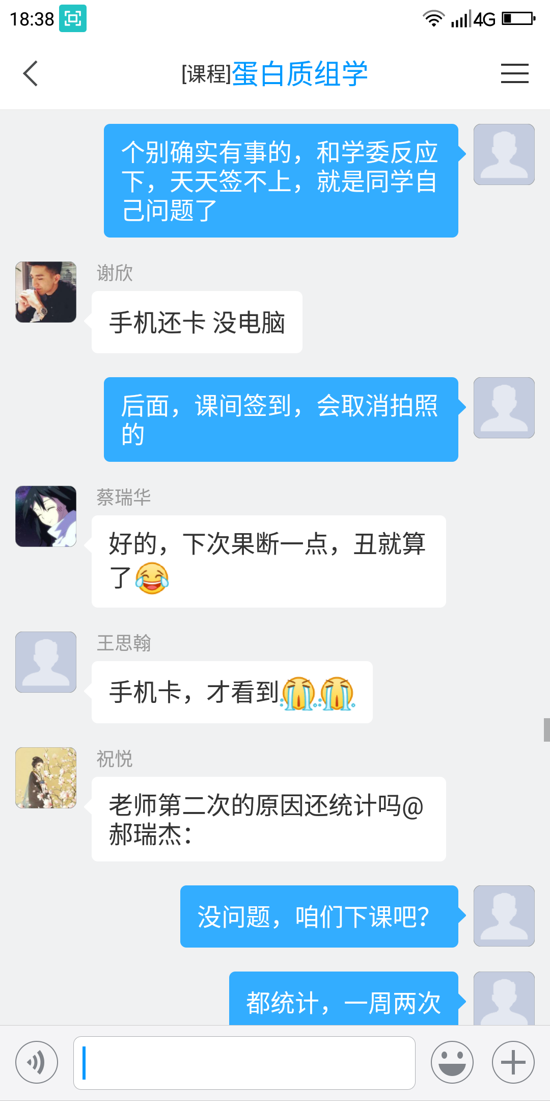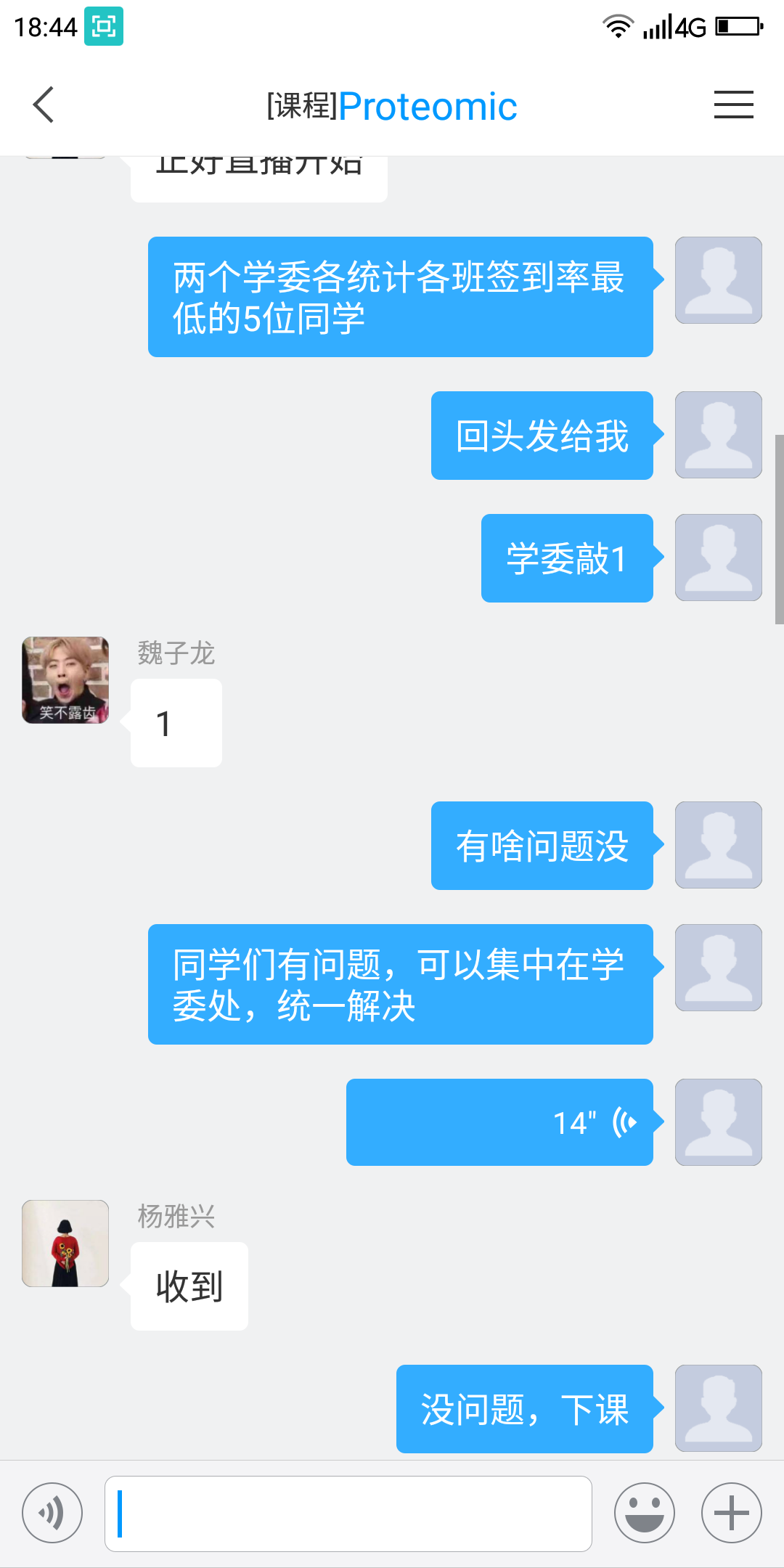 因学生众多、话题专业性强,老师为了全方位的了解学生的学习动态,会让学生课下,就自己感兴趣的、不清楚的内容(也包括非课程内的知识)统一向班级学习委员反应。学委统一整理,发给老师,下次上课统一答疑解惑。学委课下,及时了解未上课(未签到)同学的情况,并通知到个人,督促她们按时上课。必要时,郝瑞杰老师会根据学生情况亲自和学生沟通。