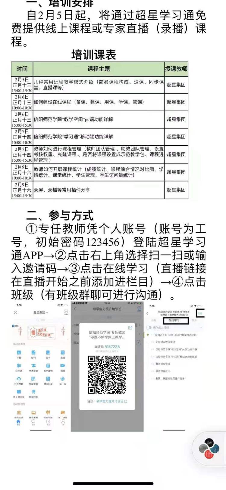 学校学院两级领导及有关部门关于网上授课计划制定了详细的操作章程及实施细则,并开展了一系列教学活动,对任课老师进行集中培训,以确保任课老师可以熟练的操作学习通等相关网络教学平台,并建