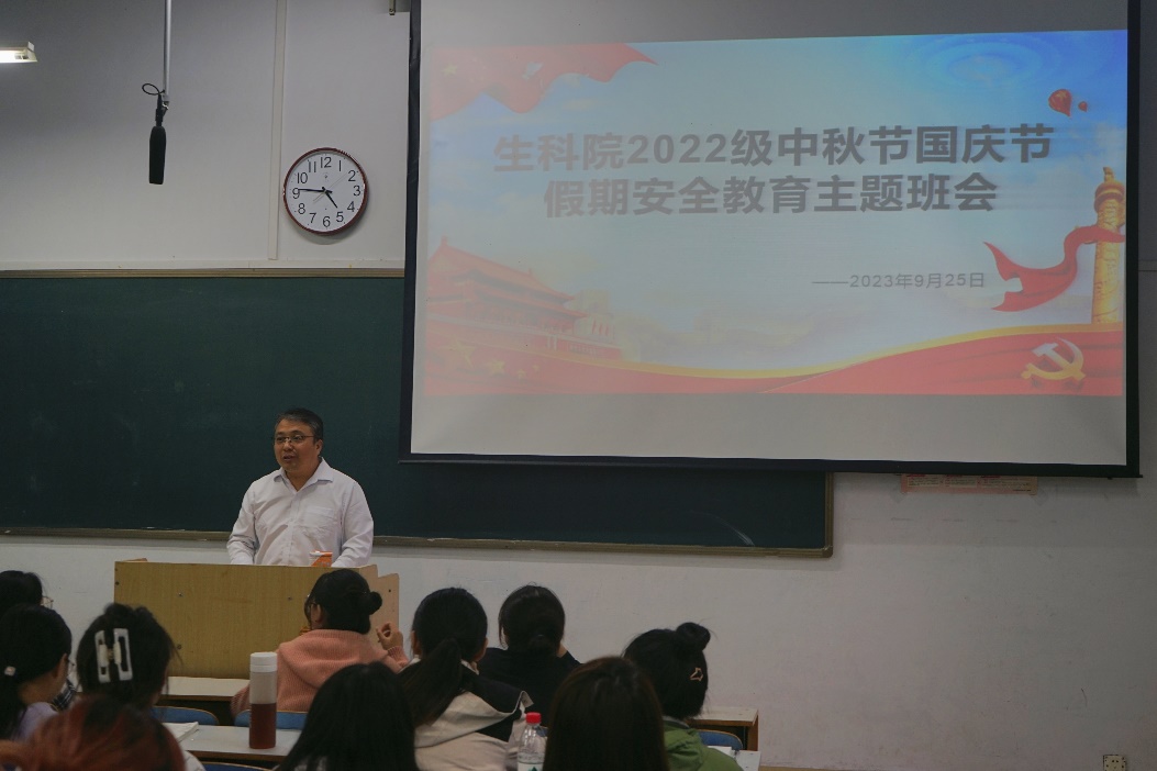 为确保学生在即将到来的中秋节和国庆节假期度过一个安全、愉快的时光,9月25日下午,我院于教九502教室召开2022级中秋节国庆节假期安全教育主题班会,会议由分团委书记熊蕾主持,2022级全体同学参加此次会议,党委副书记荣宪举出席会议。