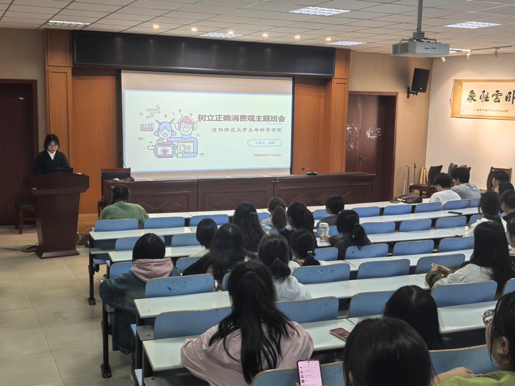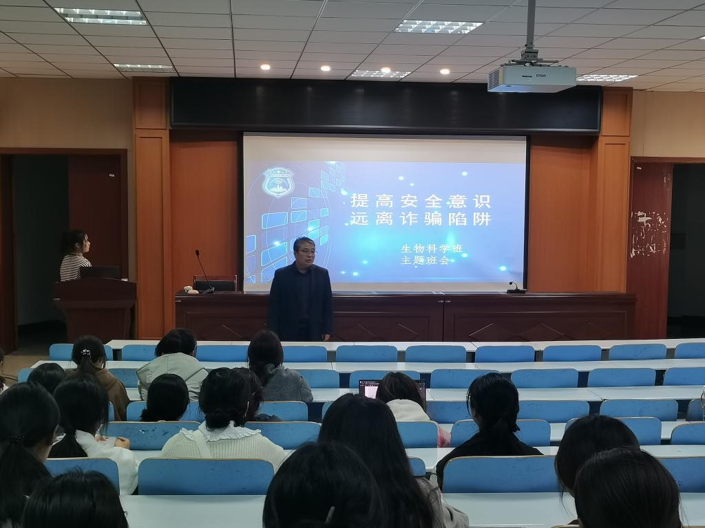 为加强同学们的安全意识,打造良好安全的校园环境。11月8号,我院在生科楼414报告厅召开2024级预防诈骗及树立正确消费观主题班会。会议由2024级专职辅导员洪瑞主持,党委副书记荣宪举、2024级生物科学全体同学参加会议。