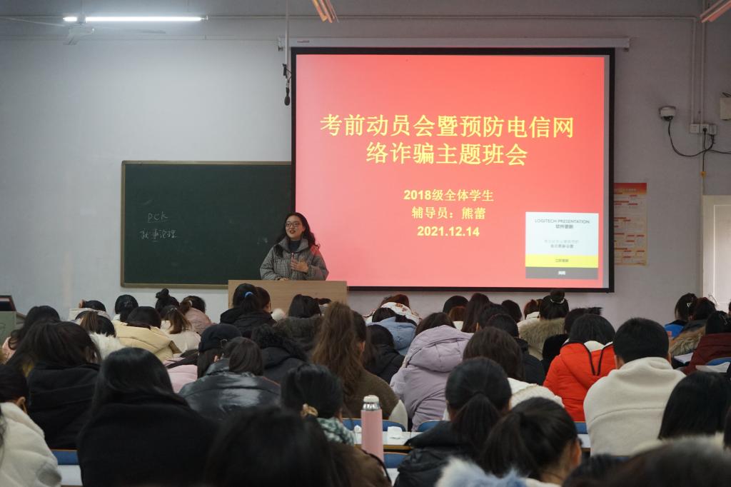 荣宪举指出电信诈骗是指通过电话、网络和短信方式,编造虚假信息,设置骗局,对受害人实施远程、非接触式诈骗,诱使受害人打款或转账的犯罪行为。他强调,作为新一代大学生我们应当增强防范意识,拒绝与陌生人进行网络金钱交易,多与老师、同学进行沟通,及时发现并举报电信网络诈骗行为;提醒大家考试过程中需要注意的事项,学院会给大家提供最好的后勤保障和服务,并预祝大家努力学习并祝愿取得理想成绩。熊蕾为学子进行考前动员中强调了诚实守信是人的基本原则,避免在自己学生生涯中留下不光彩的一笔;面对即将到来的考研,每位学子也应当放平心态,积极应考;在考试前应做好充足的准备,在考试过程中沉着应对。