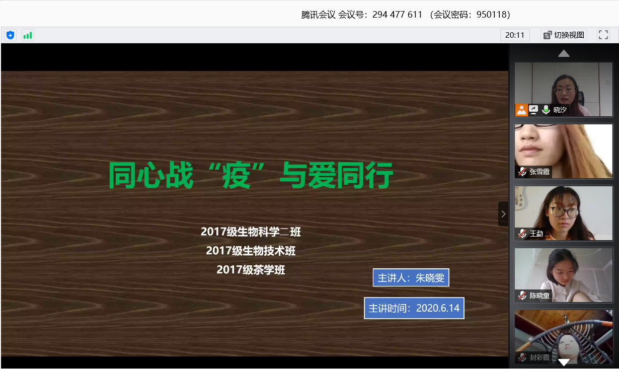 为弘扬爱国主义精神,加强疫情防控期间学子们的思想教育和价值引领,保障网上教学顺利进行,坚定学子们考研信念。6月14日下午,我院2017级生物科学二班、2017级生物技术班、2017级茶学班开展“同心战‘疫’,与爱同行”线上主题班会。班会由专职辅导员朱晓雯主持。
