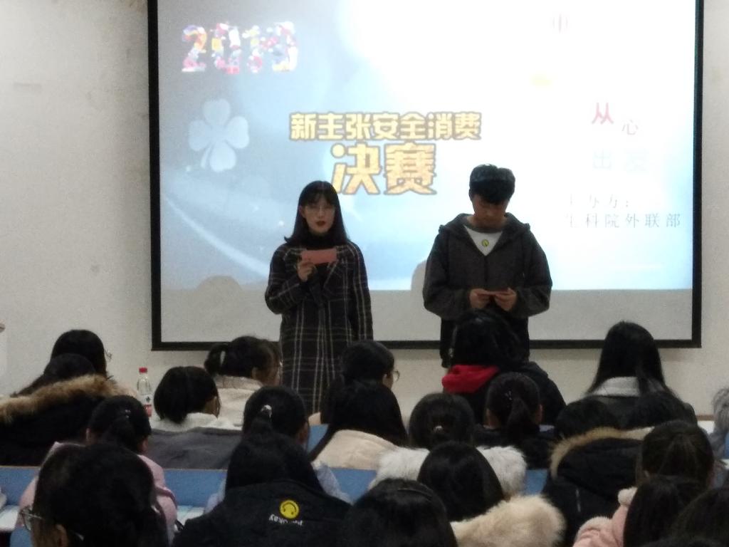 11月30日,由我院团委学生会外联部主办的“新主张安全消费”大赛决赛于生物楼414多媒体教室完美收官。我院团委书记熊蕾和部分学生干部担任评委。