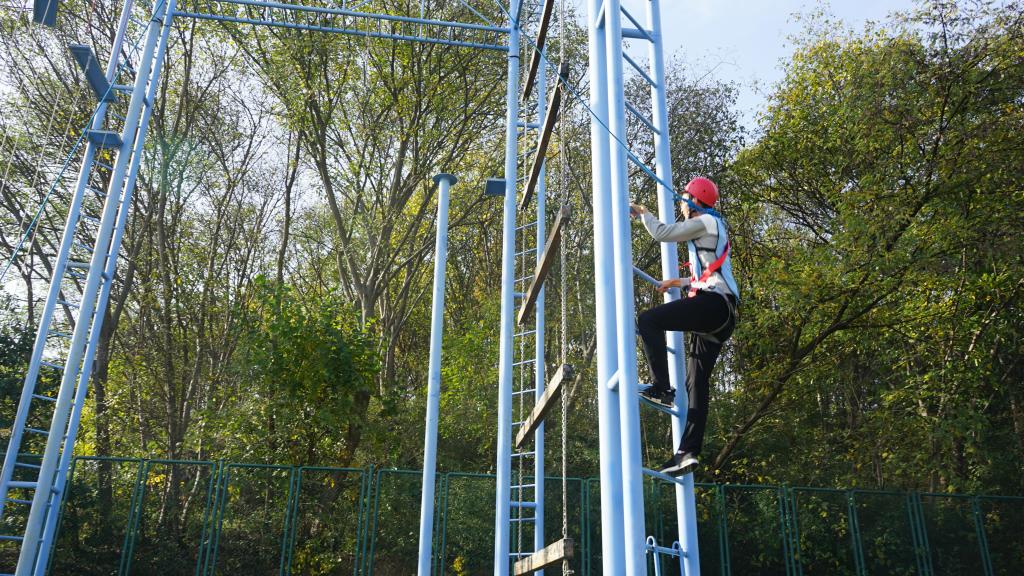 活动现场,我院学子秩序井然地集合站队并完成分组,积极踊跃参与此次素质拓展训练。此次拓展活动共组织安排“极速60秒”、“高空断桥”、“穿越电网”和“毕业墙”四个训练项目,活动生动有趣、精彩纷呈。“极速60秒”项目中,教练员准备30张包含数字信息的图片,参与队员需要在60秒内将图片按照数字顺序排列好,同学们分工明确、分组记忆、完成挑战。“毕业墙”要求所有成员在规定时间内翻越一面光滑的高墙,该项目需要众人合力托举成员依次翻越,有利于提高同学们的安全保护意识和交流合作意识。“高空断桥”项目中,同学们相互鼓励、克服恐惧、战胜自我,在高空中完成跨越。“穿越电网”项目主要考验同学们的处事思维能力,我院学子通过分工、协作,最终完成挑战,极大的培养了队员间团结互助的意识。拓展训练期间,同学们集思广益、团结协作、积极配合、迎难而上,充分展现出当代大学生积极向上、勇于进取的精神风貌。
