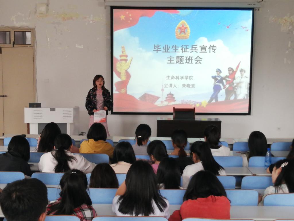为培养学生爱国情怀,加强征兵政策宣传。5月18日,我院于生物楼414多媒体教室召开毕业生征兵宣传主题班会。会议由我院武装干事朱晓雯主持,2021届毕业生参加此次会议。