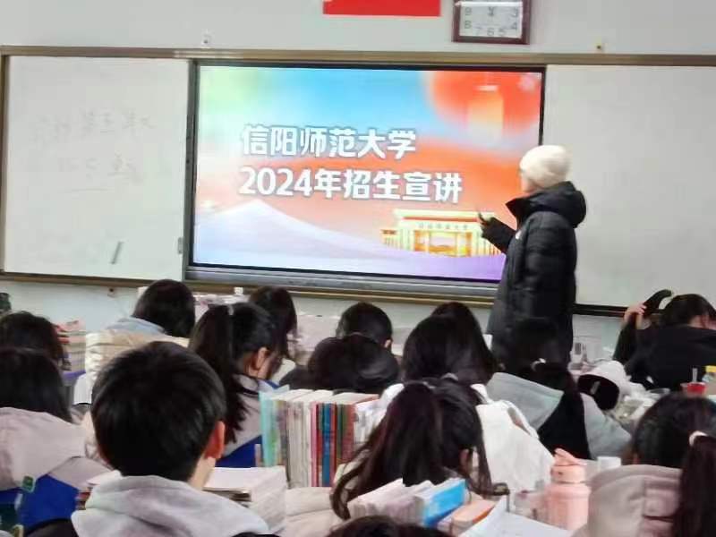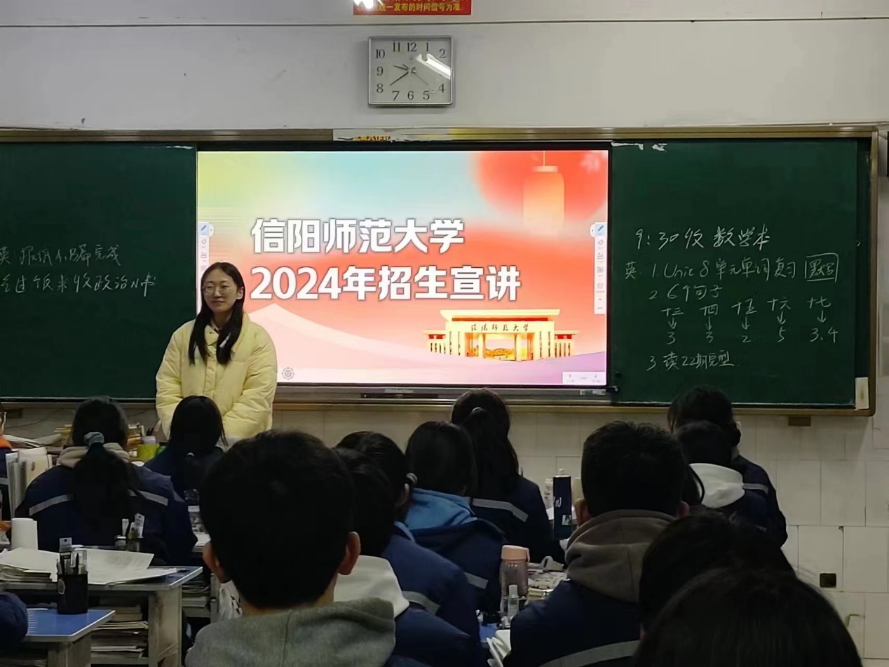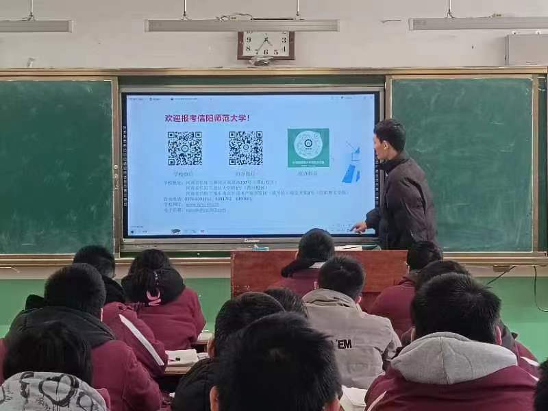 团队成员提前与老师交流沟通后来到了武涉县第一中学,鲁山第二高中等。张星、张琬莹、朱楸妤、王开妍、李鹏程利用多媒体仔细介绍了学校环境,学校概况以及学校新的招生政策。成员们展示自己在大学里的学习和生活情况,结合亲身经历,分享了大学生活的点点滴滴。为同学们耐心解答疑惑,分享学习心得和成长经历。