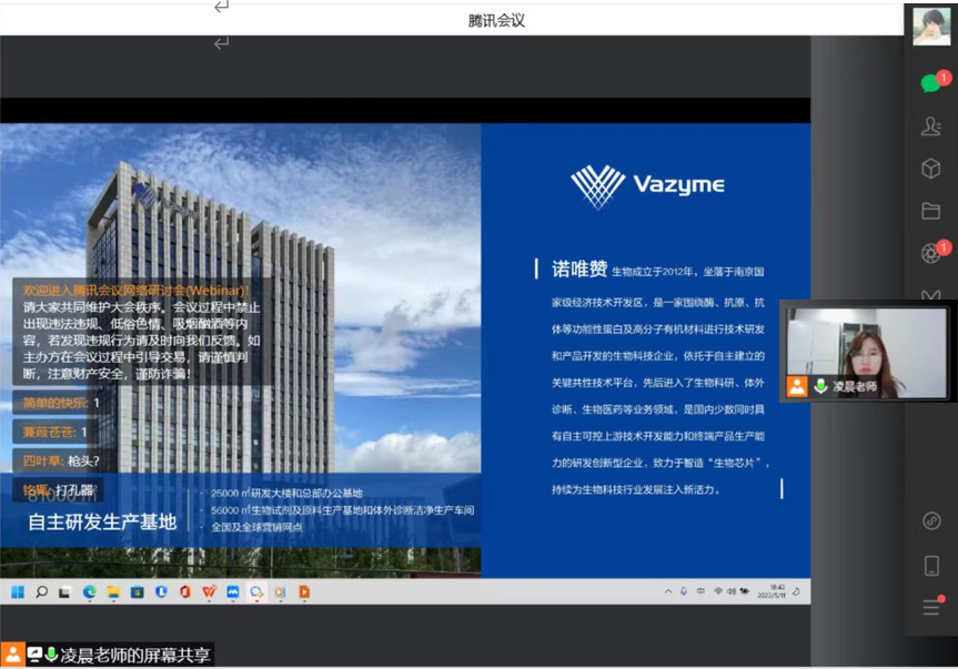 南京诺唯赞生物科技股份公司人事部经理凌晨招聘单位通过播放宣传片、PPT展示、线上连线交流的方式向同学们详细介绍公司的概况、软、硬件条件、发展历程、企业文化、核心技术等。南京诺唯赞生物科技股份公司成立于2012年3月,是一家围绕酶、抗原、抗体等功能性蛋白及高分子有机材料进行技术研发和产品开发的生物科技企业,依托于自主建立的关键共性技术平台,先后进入了生物试剂、体外诊断和生物医药业务领域,目前拥有六大技术平台:酶定向进化平台、缓冲化学筛选平台、化学合成平台、高密度发酵平台、蛋白性质分析平台、信息分析平台,同时具有自主可控上游技术开发能力和终端产品生产能力的研发创新型企业的研发团队具有雄厚的研发实力,硕士及以上学历人员占比50%以上。随后凌晨对大家关心的招聘岗位、工作职责、任职要求、薪资待遇等方面内容进行了答疑,并与我院学生互留了联系方式。