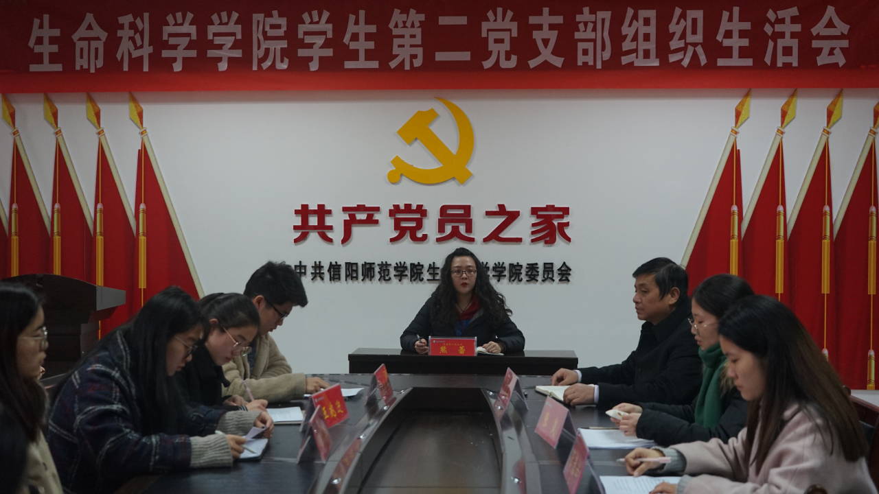 为推动“不忘初心,牢记使命”主题教育走深走实,确保基层党组织和广大党员牢记初心使命,永葆党员本色。12月6日,我院在生物楼412会议室,召开学生第二党支部组织生活会。党委副书记杨霁虹,学生第二党支部书记熊蕾及第二党支部全体党员参与此次会议。会议由熊蕾主持。