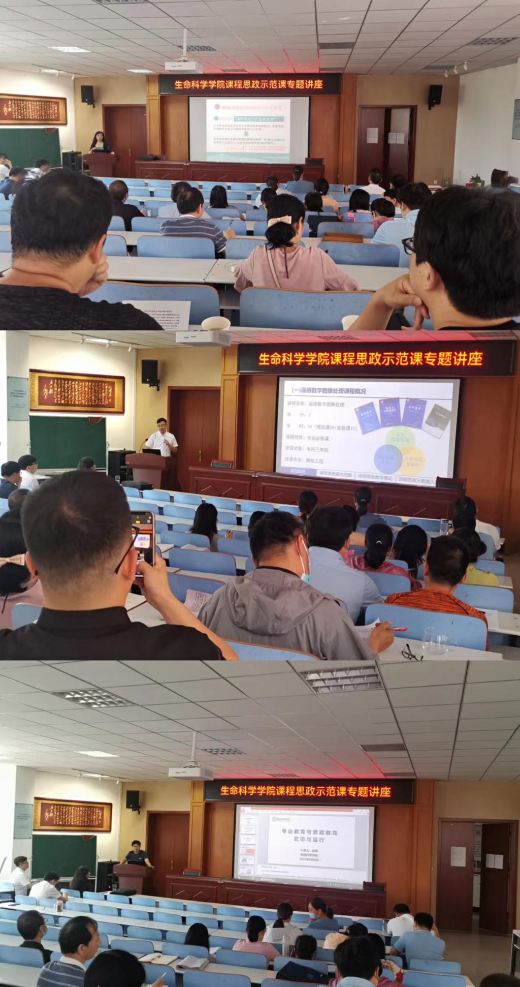 为深入贯彻国家、省级、学校课程思政建设的相关会议精神,强化教师课程思政教学意识和素养,把课程思政教育贯穿人才培养体系,提高立德树人水平和人才培养质量。6月6日上午8:30,我院于生科楼414报告厅开展了“课程思政示范课”专题讲座,此次讲座邀请美术与设计学院郑蔚老师、地理科学学院颜伟老师来我院做课程思政示范课专题报告。我院领导、全体教师听取了讲座。讲座由教学副院长荆胜利主持。