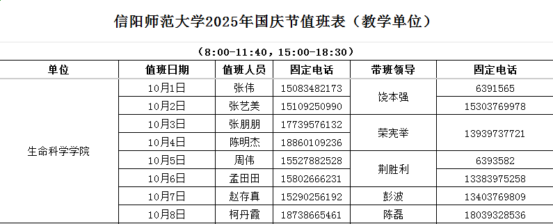 根据学院值班人员安排制度,假期值班安排如下: