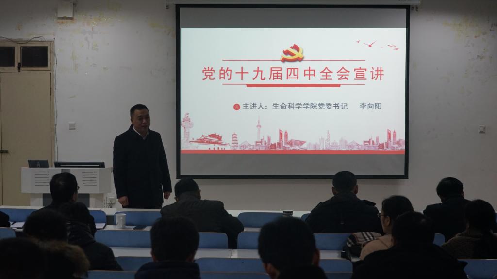 为深入学习和贯彻党的十九届四中全会精神,推进我院党委工作高效有序进行,12月24日,我院于生物楼414会议室开展党的十九届四中全会宣讲会议。党委书记李向阳,院长袁红雨,党委副书记杨霁虹,党委副书记、副院长宋新强,党委委员、副院长张海宾,纪检委员、遗传研究所副所长饶本强共同参加此次会议。会议由李向阳主讲。