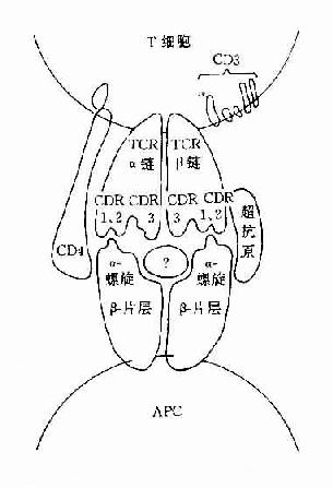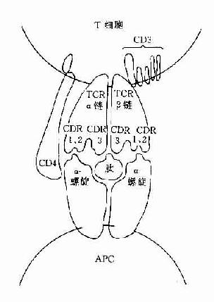 CD3分子可与TCR分子以非共价结合形成一个TCR-CD3复合受体分子,是T细胞识别抗原的主要识别单位。其中TCR是识别异种抗原和自身MHC分子多态性决定族的受体,而CD3分子交不参予抗原识别,它具有稳定TCR结构和传递活化信号的作用。